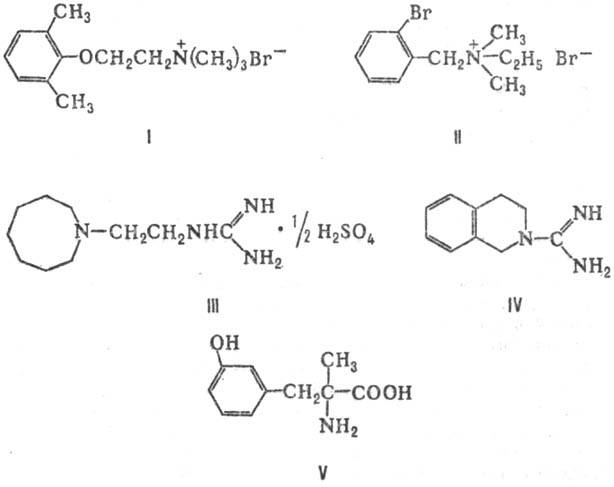 СИМПАТОЛИТИЧЕСКИЕ СРЕДСТВА, лек. в-ва, тормозящие передачу нервного возбуждения с адренергич. нервных волокон на исполнит. орган (сердце, сосуды и др.). К симпатолитическим средствам относятся: Г) четвертичные аммониевые основания, напр. ксилохолин (ТМ 10, ф-ла I), орнид (бретилий, II); 2) производные гуанидина - октадин (гуанетидин, исмелин, III), бетанидин (эсбатал) С6Н5CH2NHC(NHCH3) = NCH3, дебризохин (IV); 3) алкалоиды раувольфии (Rauwolfia) семейства кутровых (Аросупасеае), в частности резерпин; 4) a-метилир. ароматич. аминокислоты, напр. a-метил-м-ти-розин (V). Для строения нек-рых синтетических симпатолитических средств характерно наличие в молекуле сильноосновной группировки (гуанидиновой, четвертичного атома азота), связанной этиленовой цепью или метиленовым звеном с карбо- или гетероциклом.