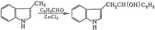С альдегидами скатол реагирует по группе СН3, напр.:
