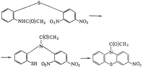 Нуклеофугные группы в орто-положениях арила соединений Ar-X-Z-YH и Ar-Y-Z-XH достаточно легко подвергаются внутримол. нуклеоф. замещению с образованием би-и полициклич. систем с двумя гетероатомами X и Y в одном цикле. При этом необходимо учитывать возможность протекания Смайлса перегруппировки. Так, o-гидроксидифенилсульфиды циклизуются в феноксатиины без Смайлса перегруппировки, а циклизации о-аминодифенил-сульфидов в фенотиазины предшествует Смайлса перегруппировке, напр.: