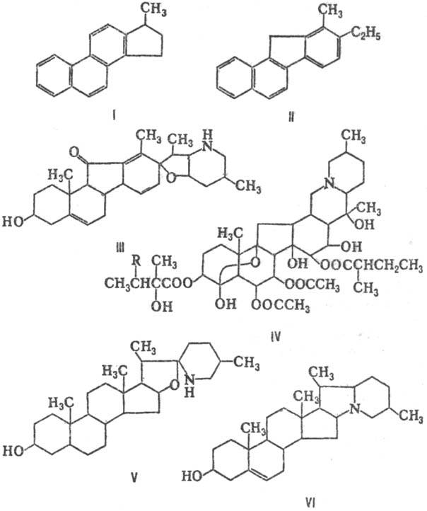 Часто различают четыре группы стероидных алкалоидов, к-рые выделяют из растений родов паслен (Solanum), чемерица (Veratrum), голаррена (Holarrhena), фунтумиа (Funtumia), самшит (Buxus). Наиб. значение имеют алкалоиды чемерицы и паслена. Первые иногда делят на две группы в зависимости от числа атомов кислорода в их молекулах. Алкалоиды одной группы содержат 1-4 атома О и обычно присутствуют в растениях в виде своб. аминов или моно-D-гликозидов. Типичный представитель этого класса стероидных алкалоидов-иервин (III). Молекулы алкалоидов др. группы содержат 7-9 атомов кислорода и находятся в растениях в виде сложных эфиров. Примерами могут служить протовератрины А (IV; R = Н) и В (IV; R = ОН), используемые в фармакологии. При внутривенном введении они вызывают брадикардию и снижают кровяное давление. Осн. недостатки их как лек. ср-в-небольшая разница между терапевтич. и токсич. дозами и наличие побочных эффектов.