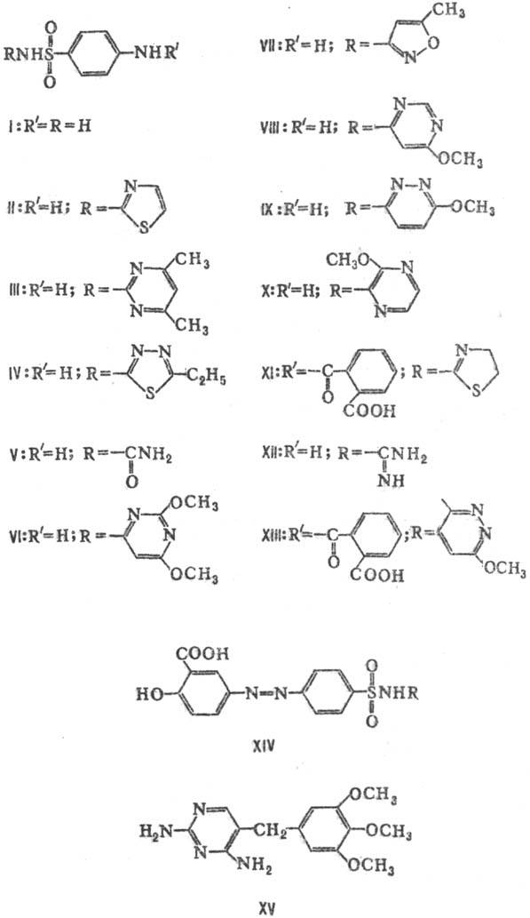 Обычно применяют комбинир. препараты, содержащие СП и производные диаминопиримидина, потенцирующие действие СП, напр.: бисептол (бактрим)-смесь сульфамет-оксазола (VII) и триметоприма (XV) в соотношении 5:1; сульфатен-смесь сульфамонометоксина (VIII) и триметоприма в соотношении 2,5:1.