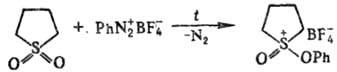 Сульфолан обладает хим. св-вами сульфонов. Устойчив к действию 93%-ной H2SO4 и конц. р-ра NaOH, а также при нагр. в присут. Сu, Fe или К2СО3. Хлорирование сульфолана Сl2 приводит к образованию смеси моно-, ди-, три- и тетрахлор-сульфоланов, взаимод. с SO2Cl2-только к 3-хлорсуль-фолану. При термолизе или УФ облучении сульфолан разлагается на этилен и SO2; под действием LiAlH4 или (изо-С4Н9)2А1Н восстанавливается до тетрагидротиофена. При взаимодействии с солями арилдиазония сульфолан проявляет нуклеоф. свойства, напр.: