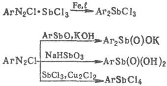 При восстановлении R3SbX2, диарилстибиновых и арил-стибоновых к-т образуются соответственно R3Sb, Ar2SbX и ArSbX2; при разложении R3SbX2 и R2SbX3-соответственно R2SbX и RSbX2; нагревание Sb с RX (R = Alk, Ph, винил) в присутствии Си приводит к смеси R2SbX и RSbX2; р-ция R2SbNa с R'X дает R2SbR'. Для получения ArSbO и Ar2SbX используют разложение двойных диазониевых солей порошком Zn (диазометод Несмеянова), напр.: