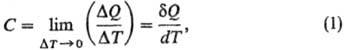 где DQ- кол-во теплоты, сообщенное системе и вызвавшее изменение ее т-ры на DТ. Отношение конечных разностей DQ/DТ наз. средней теплоемкостью, отношение бесконечно малых величин dQ/dT-истинной теплоемкостью. Поскольку dQ не является полным дифференциалом ф-ции состояния, то и теплоемкость зависит от пути перехода между двумя состояниями системы. Различают теплоемкость системы в целом (Дж/К), удельную теплоемкость [Дж/(г·К)], молярную теплоемкость [Дж/(моль·К)]. Во всех ниже приведенных ф-лах использованы молярные величины теплоемкости.