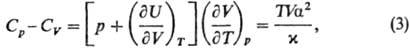 где a = V-1(9V/9Т)р-коэф. термич. расширения, x = = — V-1(9V/9р)T-коэф. изотермич. сжимаемости. Поскольку по условиям устойчивости фаз Ср, CV > 0 и (9V/9р)T < 0, то согласно (3) Ср > CV. Это естественно, т. к. при изобарич. нагревании часть тепла, помимо увеличения внутр. энергии системы, идет на работу расширения. Для идеальных газов (9U/9V)T = 0 и учет ур-ния состояния pV= RT приводит к соотношению: Сp - CV = R (R-газовая постоянная). Из определений (1) и (2) следует, что для изотермич. процесса С = ,, для адиабатич. процесса С = 0.