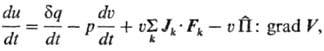 где и, u, q-уд. локальные (относящиеся к нек-рому выделенному элементу объема) внутр. энергия, объем и кол-во тепла соотв.; p -давление; Jk- диффузионный поток k-го компонента в поле внеш. силы Fk, действующей на единицу массы k-го компонента (точка означает скалярное произведение); V-вектор скорости центра масс системы в поле внутр. напряжений; П-тензор вязких напряжений (вязкий тензор давления);