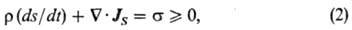 где r-плотность, s-уд. локальная энтропия, Js-вектор потока энтропии. Величина s = dis/dt представляет собой локальную скорость возникновения энтропии за счет необратимых процессов, протекающих внутри выделенного элемента объема, и наз. локальным произ-вом энтропии. Положит. знак произ-ва энтропии (s > 0) определяется только необратимыми процессами (напр., диффузией, теплопроводностью, вязкостью). Ур-ние баланса энтропии суть выражение второго начала термодинамики в термодинамике необратимых процессов.