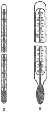 Действие жидкостных термометров основано на различиях коэф. теплового расширения рабочего, или термометрич., в-ва (ртуть, этанол, пентан, керосин, иные орг. жидкости) и материала оболочки, в к-рой оно находится (термометрич. стекло либо кварц). Несмотря на большое разнообразие конструкций, эти термометры относятся к одному из двух осн. типов: палочные (рис. 1, а) и с вложенной шкалой (рис. 1, б). Особенно распространены ртутные стеклянные термометры, подразделяемые на образцовые (1-го разряда-только палочные, 2-го разряда-оба типа), лабораторные (оба типа), технические (только с вложенной шкалой). Среди приборов, заполненных орг. жидкостями и используемых лишь для измерения т-р ниже — 30 °С, чаще других применяют спиртовые термометры. Все жидкостные термометры используют обычно для локальных измерений т-ры (от — 200 до 600 °С) с точностью, определяемой ценой деления шкалы. Для образцовых стеклянных термометров с узким диапазоном шкалы цена деления может достигать 0,01 °С. Точность измерений зависит от глубины погружения термометра в исследуемую среду: прибор следует погружать на глубину, при к-рой проводилась его градуировка. Достоинства этих термометров-простота конструкции и высокая точность измерений. Недостатки: невозможность регистрации и передачи показаний на расстояние; зависимость показаний от измерения объемов жидкости и резервуара, в к-ром она находится; тепловая инерционность; невозможность ремонта.