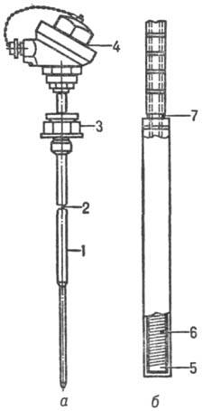 Рис. 3. Платиновый термометр сопротивления: а-общий вид; б-чувствит. элемент; 1-металлич. чехол; 2 - термоэлемент; 3-установочный штуцер; 4-головка для присоединения к вторичному прибору; 5-слюдяной каркас; 6-обмотка из платиновой проволоки; 7-выводы.