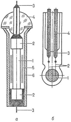 Рис. 4. Терморезисторы: а-стержневой (1-эмалир. цилиндр; 2-контактные колпачки; 3-выводы; 4-стеклянный изолятор; 5-металлич. фольга; 6-металлич. чехол); б-бусинковый (1-чувствит. элемент; 2-электроды; 3-выводы; 4-стеклянная оболочка).