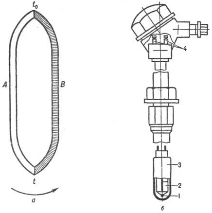 Рис. 5. Термоэлектрич. преобразователь: а-цепь из термоэлектродов А и В; б-устройство; 1-рабочий спай; 2-изолятор; 3-чехол; 4-выводы.