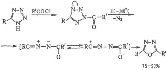 Термич. расщепление тетразольного цикла происходит при 150-200 °С; действие ацилирующих реагентов на незамещенный 1H-тетразол или его С-замещенные приводит к расщеплению цикла с послед. рециклизацией: