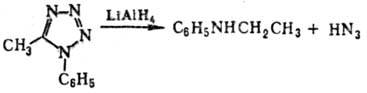 Цикл раскрывается также при действии сильных к-т при натр. выше 160°С или водных р-ров щелочей; С-замещенные 1H-тетразола в этих условиях обычно устойчивы. При действии окислителей на тетразол и его производные раскрытия цикла не происходит; под действием сильных восстановителей (LiAlH4) 1,5-дизамещенные 1H-тетразола превращ. во вторичные амины, напр.: