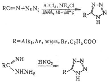 Незамещенный 1H-тетразол получают взаимод. HN3 с HCN в этаноле с выходом 80%, С-замещенные 1H-тетразола-по р-циям: