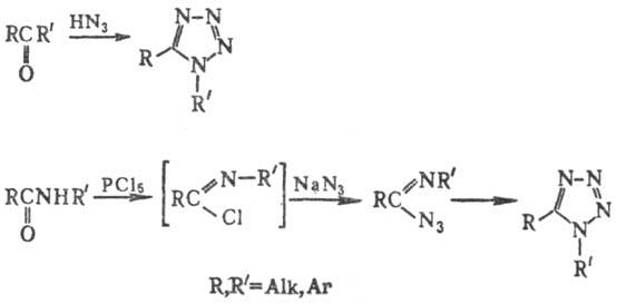1,5-Дизамещенные 1H-тетразола синтезируют взаимод. кетонов с HN3 (р-ция Шмидта) в присут. апротонных к-т (АlСl3, FeCl3, SnCl4, эфират BF3) или исходя из N-замещенных амидов: