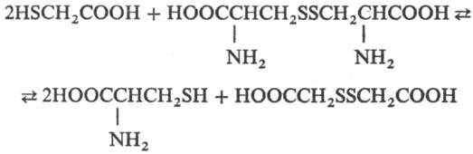 На этой р-ции основано использование тиогликолевой кислоты для хим. завивки волос (производные тиогликолевой кислоты-аммониевая соль, соль моно-этаноламина, моноглицериновый эфир-разрушают связи S—S цистина в кератине волос, под действием окислителей эти связи снова образуются).