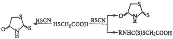 Взаимодействие тиогликолевой кислоты с тиоциановой к-той приводит к 2-тионо-1,3-тиазолидин-4-ону (роданину); с N-замещенными изотиоцианатами при рН 3,0-7,5-к N-замещенным родани-нам, при рН>9,5-к N-замещенным тиокарбамоилтио-гликолевойк-ты: