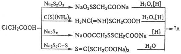 Получают тиогликолевую кислоту обработкой К- или Na-соли хлоруксусной к-ты гидросульфидами щелочных металлов в водной среде; побочно образуются гликолевая, тио- и дитиодигликолевые к-ты. Во избежание образования побочных продуктов м.б. использованы др. соединения S, напр. Na2S2O3, полисульфиды щелочных металлов, тиомочевина, тритиокарбонат Na, напр.: