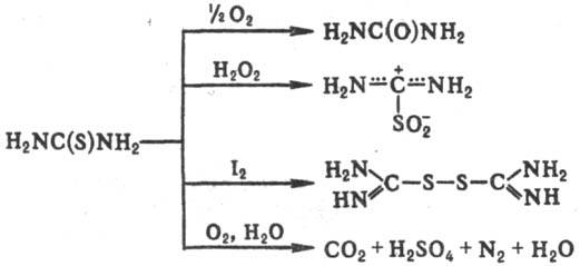 При нагр. в присут. к-т или оснований тиомочевина гидролизуется с образованием NH3, H2S и СО2. Под действием окислителей в зависимости от их природы и условий образует мочевину, формамидинсульфиновую к-ту (диоксид тиомочевины) или формамидиндисульфид, более глубокое окисление приводит к СO2, H2SO4 и N2: