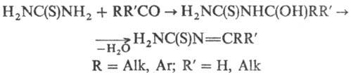 При взаимодействии тиомочевины с альдегидами или кетона-ми образуются гидроксиалкилтиомочевины, к-рые при отщеплении воды м. б. превращены в N-тиокарбамоилимины:
