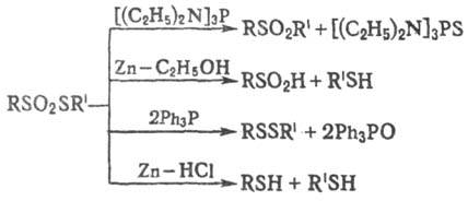 Восстановление тиолсульфонатов приводит, в зависимости от используемых реагентов, к сульфонам, сульфиновым к-там, дисульфидам и тиолам: