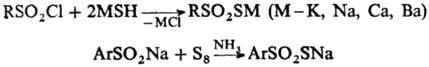 тиосульфокислоты в виде их солей получают взаимод. хлорангидридов сульфокислот с тиолатами щелочных или щел.-зем. металлов, либо солей сульфиновых к-т с элементарной серой, напр.: