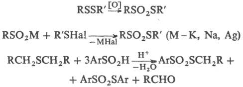 При осторожном окислении тиолсульфонатов Н2О2 получаются 1,2-дисульфоны, в более жестких условиях происходит разрыв связи S—S и образуются сульфоновые к-ты: