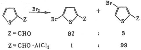 Тиофен относится к p-избыточным гетероароматич. системам и обладает выраженными ароматич. св-вами. В р-циях электроф. замещения (галогенирование, нитрование, фор-милирование, дейтерирование и др.) тиофен значительно активнее бензола (в нек-рых случаях в 100000 раз). Р-ции идут обычно (иногда исключительно) в a-положение цикла (на 2-3 порядка быстрее, чем в др. положение). Для производных тиофена, содержащих в положении 2 ориентанты II рода, р-ции идут с образованием 2,5-дизамещенных. 2,4-Изомеры получают, вводя в р-ции исходные соед. в виде комплексов с сильными протонными или апротонными к-тами, что объясняется резким увеличением электроноакцепторной способности заместителя в результате комплексообразова-ния: