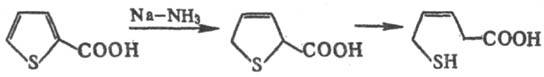 Гомологи тиофена и мн. замещенные легко превращ. в соответствующие производные тиофана в условиях ионного гидрирования, напр. при действии трифторуксусной к-ты и три-этилсилана. Дигидротиофен образуется при восстановлении тиофена Na в жидком NH3. При аналогичном восстановлении гомологов тиофена и его производных процесс обычно не останавливается на стадии образования дигидропроизводных, а происходит расщепление цикла с образованием соответствующих соед. алифатич. ряда, напр.: