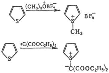 Под действием нек-рых алкилирующих агентов или ди-(этоксикарбонил)карбена образуются производные тиофена с положительно заряженным трехвалентным (сульфониевым) атомом серы, напр.:
