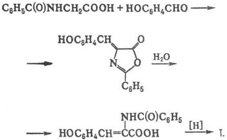 Синтез тирозина осуществляют из 4-гидроксибензальдегида и гиппуровой к-ты (т. наз. азлактонный синтез Эрленмейера-Плёхля):
