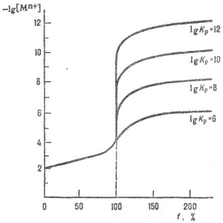 Логарифмич. кривые титрования р-ра ионов металлов Мn+ р-ром этилен-диаминтетрауксусной к-ты Н4Y; Кp - константа равновесия р-ции титрования Mn++Y4-
