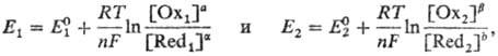 bОx2 + aRed1 + ..., где Ox1 и Ох2 - окисленные формы соотв. титранта и определяемого в-ва, Red1 и Red2-их восстановл. формы, a, b, a, b-стехио-метрич. коэффициенты. Окислит.-восстановит. потенциалы, характеризующие титрант и определяемое в-во, соотв. имеют вид: