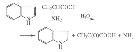-L-аминокислот [напр., цистеин, серин, CH3SCH2CH(NH2)COOH]; обратную р-цию - синтез триптофана [при избытке NH3 и CH3C(O)COOH]; замещение индо-лильного остатка в триптофане (в т.ч. если в цикле есть заместители) на C6H5S, CH3S, HS и RO при действии соотв. C6H5SH, CH3SH, H2S и ROH; изотопный обмен a-Н-атома на дейтерий у мн.