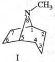 ТРОПАНОВЫЕ АЛКАЛОИДЫ, содержат в молекуле остаток тропана (ф-ла I) и являются сложными эфирами аминоспиртов и карбоновых K-T. Аминоспирты представляют собой, как правило, производные тропана, тропина (3-гидрокситропан), эк-гонина (З-гидрокси-2-карбокситропан), 3,7-дигидрокситропана, скопина (6,7-эпок-ситропин), телоидина (3,6,7-тригидрок-ситропан) и др. Из K-T в этих алкалоидах наиб, часто встречаются троповая C6H5CH(CH2OH)COOH, бензойная C6H5COOH, вератровая (3,4-диметоксибензойная), изовале-риановая, (+)-