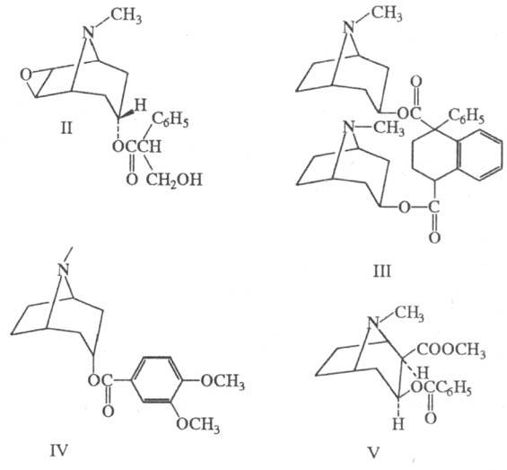 Иногда среди тропановых алкалоидов выделяют группы атропина и кокаина. Алкалоиды группы атропина представляют собой производные тропана с заместителями, гл. обр. в положениях 3,6,7. Атропин - рацемат гиосциамина - сложного эфира тропина и троповой к-ты, содержится (в кол-ве 0,1-0,5%) в белладонне (Atropa belladonna), белене (Hyoscyamus niger), скополии (Scopolia tangutica) и др. видах семейства пасленовых. В тех же растениях содержится родственный алкалоид скополамин (II) - сложный эфир скопина и троповой к-ты - бесцв. кристаллы, хорошо раств. в воде, хуже - в этаноле;