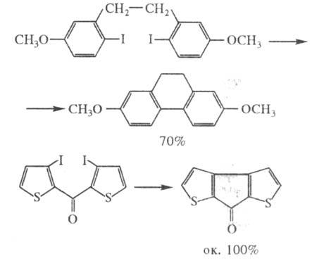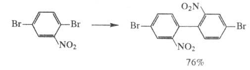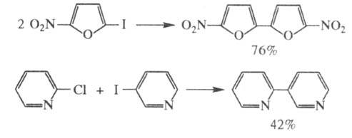 Если в Ульмана реакцию или подобные ей р-ции вовлекаются дигалоге-ниды, то возможно получение линейных полиаренов или полигетероаренов. Р-ция м. б. остановлена на стадии образования относительно низкомол. олигомеров добавлением мо-ногалогенидов, напр.: