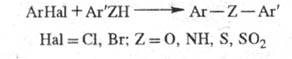2) Конденсация арилгалогенидов с фенолами, тиофенола-ми, ароматич. аминами или арилсульфиновыми к-тами в присут. меди, приводящая к диариловым эфирам, диарилами-нам, диарилсульфонам или диарилсульфидам: