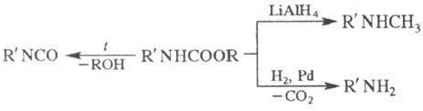 При пиролизе уретанов образуются изоцианаты, при восстановлении LiAlH4 - N-метиламины, при каталитич. гидрировании или обработке Na в жидком NH3 - первичные амины: