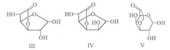 Хим. св-ва уроновых кислот аналогичны св-вам моносахаридов; отличия обусловлены присутствием в молекуле группы COOH, в результате чего уроновые кислоты могут давать соли и лактоны. Легкость лактони-зации и структура лактона определяются природой исходной уроновой кислоты. Так, D-глюкуроновая и D-маннуроновая к-ты самопроизвольно превращаются в 3,6-лактоны (Ш и IV), в к-рых моноса-харид имеет фуранозную форму; D-галактуроновая к-та самопроизвольно не лактонизуется, а получаемый из нее в кислых условиях 3,6-лактон имеет пиранозную форму (V).