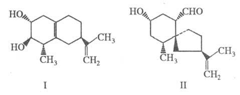 Олигосахарины осуществляют запуск большого каскада биохим. р-ций, конечной стадией к-рых является синтез стрессовых метаболитов, или фитоалексинов,- защитных в-в, синтезируемых растениями в ответ на заражение их фитопа-тогенными грибами. Так, основные фитоалексины картофеля - ришитин (ф-ла I) и любимин (П). Олигосахарины стимулируют также биосинтез лигнина в клеточных стенках растения, препятствуя дальнейшему проникновению гриба.