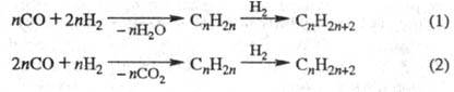 ФИШЕРА - ТРОПША СИНТЕЗ, каталитич. гидрирование оксида углерода с образованием смеси углеводородов; в зависимости от катализатора и условий, в к-рых осуществляется синтез, процесс преим. протекает по схеме (1) или (2):