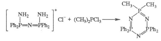 Циклофосфазены обычно получают взаимод. линейных фосфазосоединений, имеющих концевые группы NH2, с галогенфосфоранами, напр.: