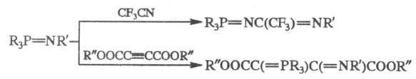 В р-циях фосфазосоединений с нитрилами образуются новые типы фосфазосоединений, а с ацетиленами - алкилиденфосфораны, напр.: