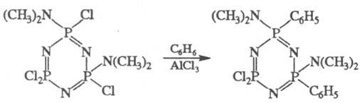 Циклофосфазены легко вступают в р-ции замещения (в т. ч. по Фриделю-Крафтсу), напр.: