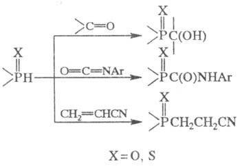 фосфинсульфиды - смесь к-т [R2P(O)OH и R2P(S)SH]. Во вторичных фосфиноксидах и фосфинсульфидах атом H может быть замещен на Cl действием CCl4 в смеси с NR3. Большинство соед. рассматриваемого типа способно присоединяться к соед. с кратными связями (альдегидам, кетонам, амидам и нитрилам,