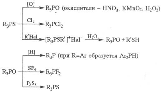 Фосфиноксиды более сильные основания, чем фосфинсу-льфиды, но слабее N-оксидов. Фосфиноксиды образуют с к-тами НА комплексы или соли [R3POH]+A-. Комплексы фосфиноксидов с к-тами Льюиса (BF3, SO3, SiHal4) и солями металлов более устойчивы, чем комплексы фосфинсульфи-дов. В мягких условиях фосфиноксиды дают с калием ион-радикалы (R3PO-)K+, тогда как фосфинсульфиды при действии щелочных металлов восстанавливаются до третичных фосфинов. Известно мн. р-ций с участием фосфорильной P = О и тиофосфорильной P = S групп, напр.: