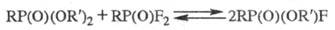 При действии PCl5 полные и кислые фосфонаты превращаются в хлорангидриды RP(O)(OR')С1, при действии RC(O)F полные фосфонаты- во фгорангидриды. При нагр. хлорангидридов RP(O)(OR')Cl с кислыми фосфонатами образуются пирофосфонаты RP(O)(OR')OP(O)R(OR'). При смешении полного фосфоната и RP(O)F2 при 100-150 0C спустя 20-30 ч устанавливается равновесие: