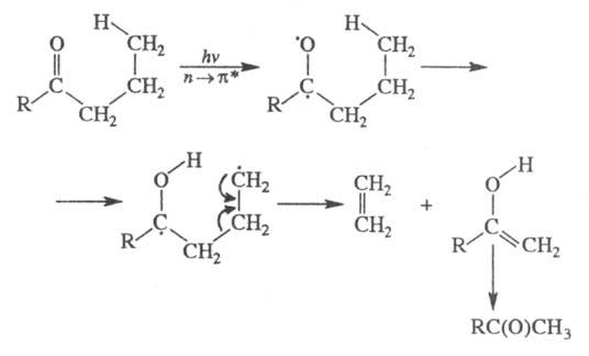 В жидкой фазе карбонильные соед. элиминируют олефины (р-ция Норриша, тип П); р-ция протекает через стадию миграции g-H-атома к атому кислорода возбужденной карбонильной группы; образующийся енол затем изомеризуется в кетон, напр.: