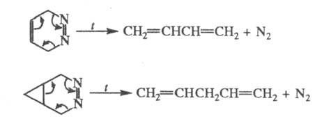 3) Расщепление циклов (обычно в условиях пиролиза) с образованием т. наз. малых молекул (СО, CO2, CH2=CH2, N2 и др.), отличающихся значительной термодинамич. устойчивостью (циклофрагментация, циклораспад), напр.: